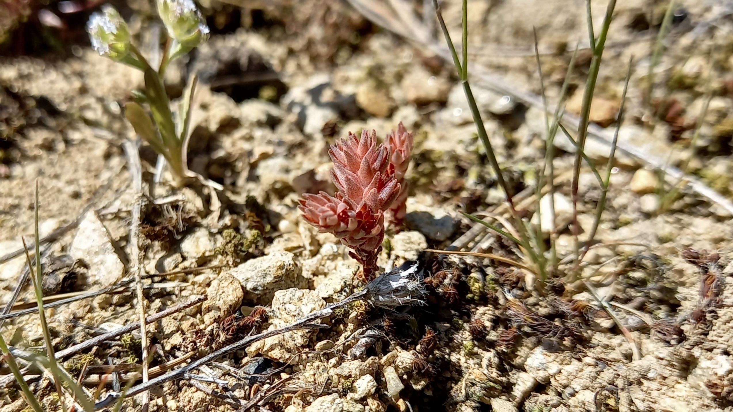 Habitat: Open habitats – dry grassland, rocks and rocky terrains with shallow soil. Found in the southern slopes of the mountain. Other Sedum species growing in the same habitat are Sedum caespitosum (Cav.) DC., Sedum hispanicum L. and Sedum urvillei DC.