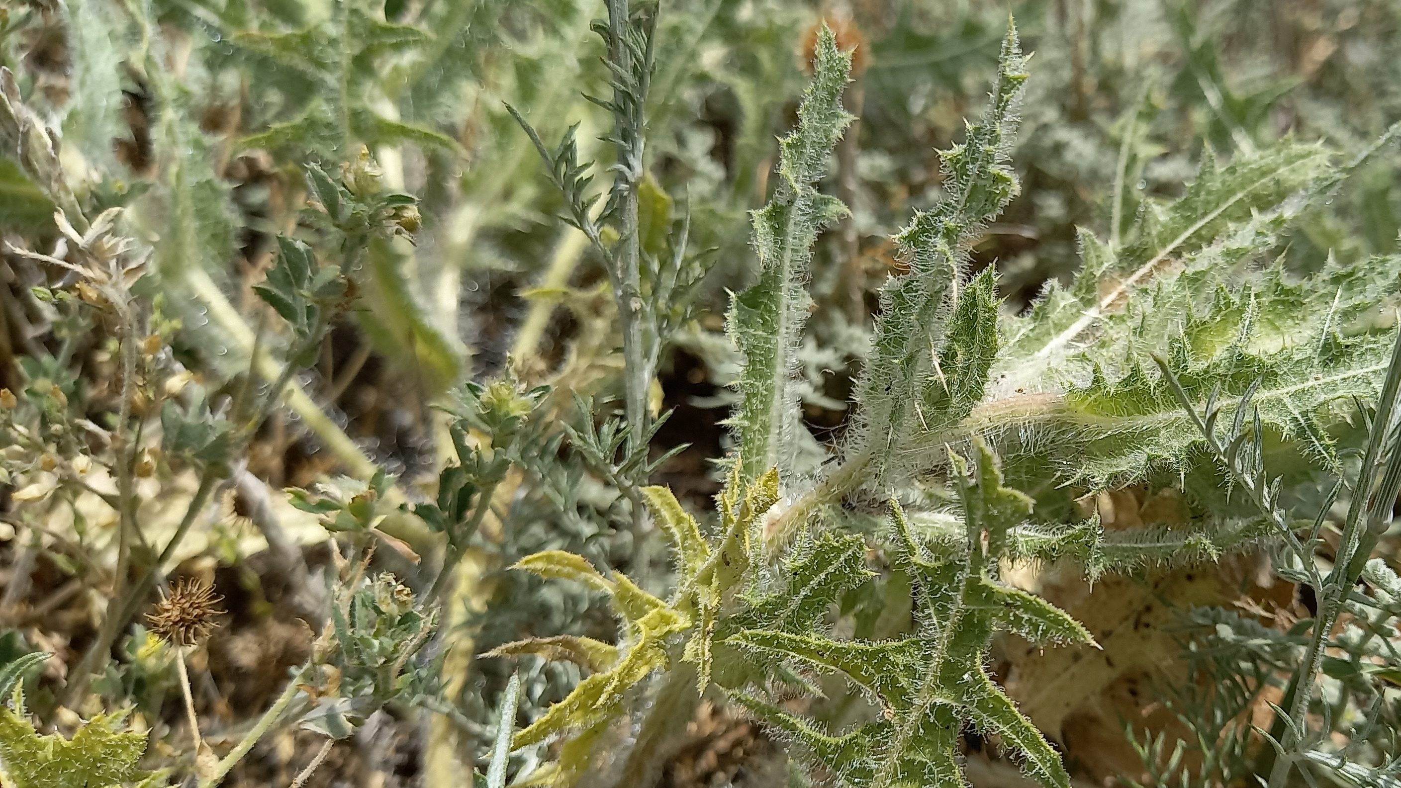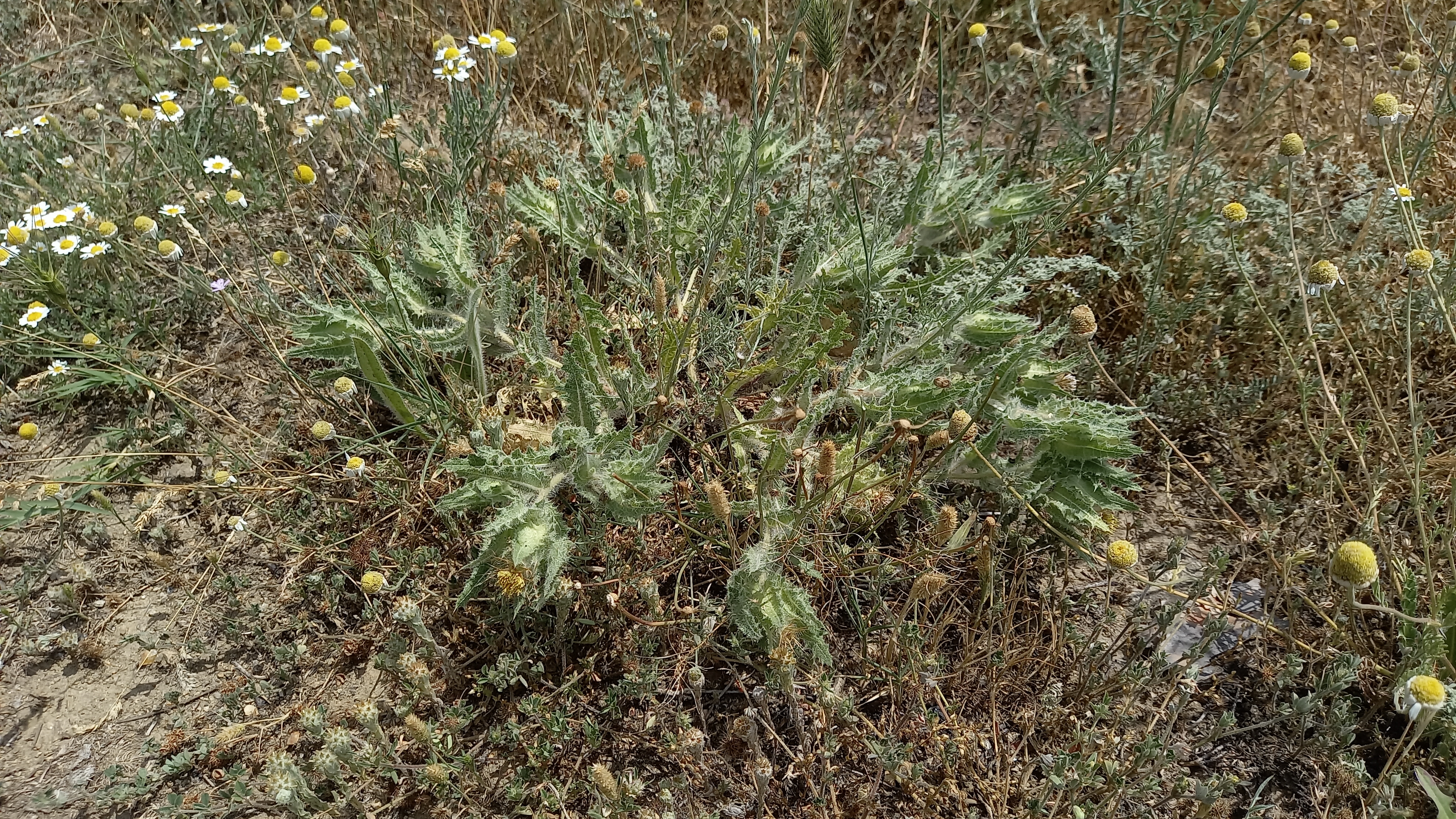 Determined according to the botanical key provided in Flora Europaea Vol. 4 (Tutin et al., 1976) as Cnicus benedictus L. The accepted name in The Euro+Med PlantBase (source: Greuter, 2006+) is Centaurea benedicta (L.) L.
